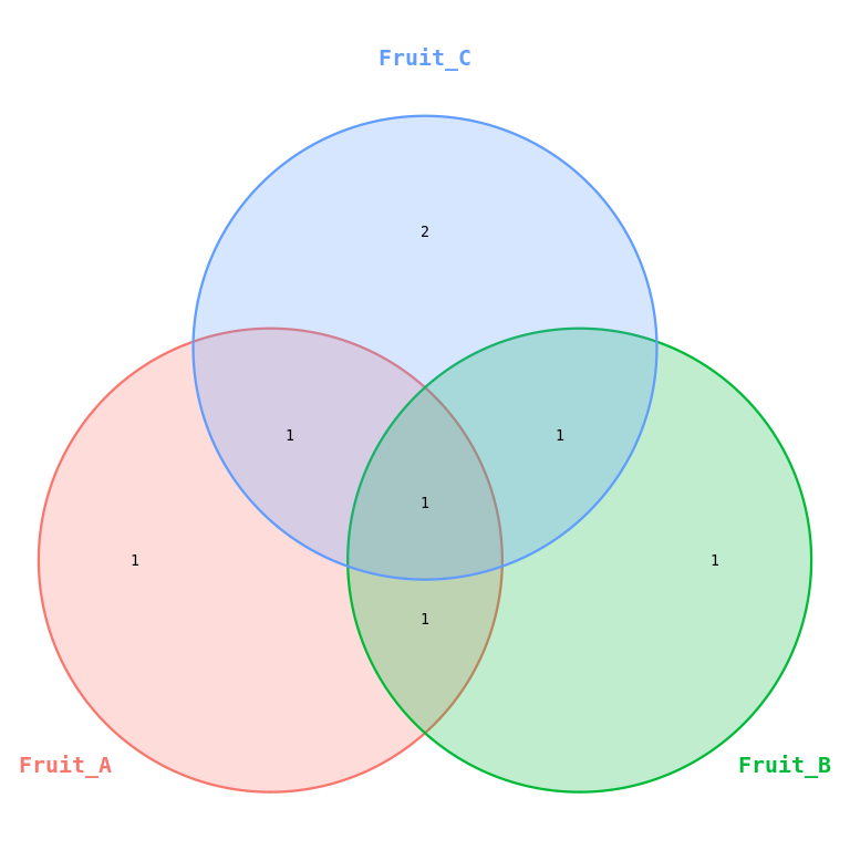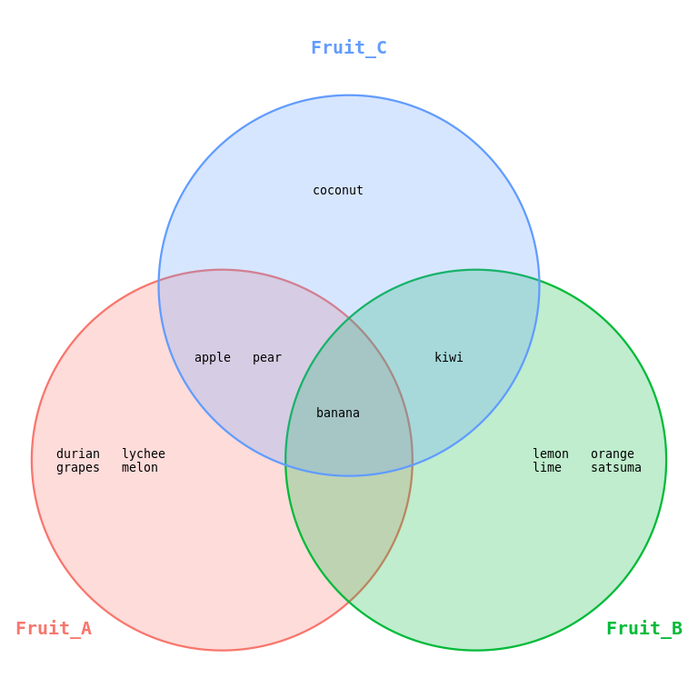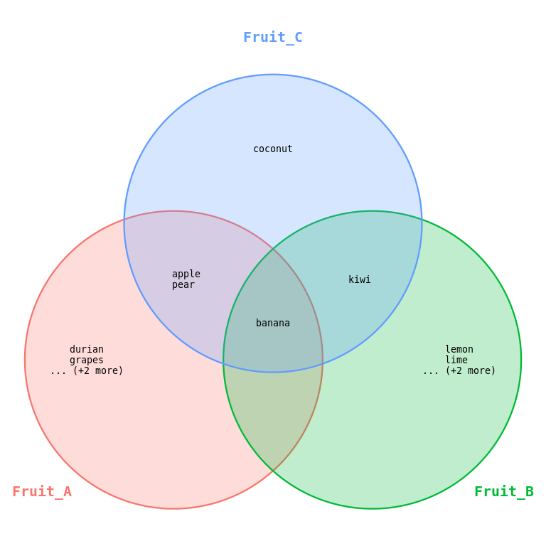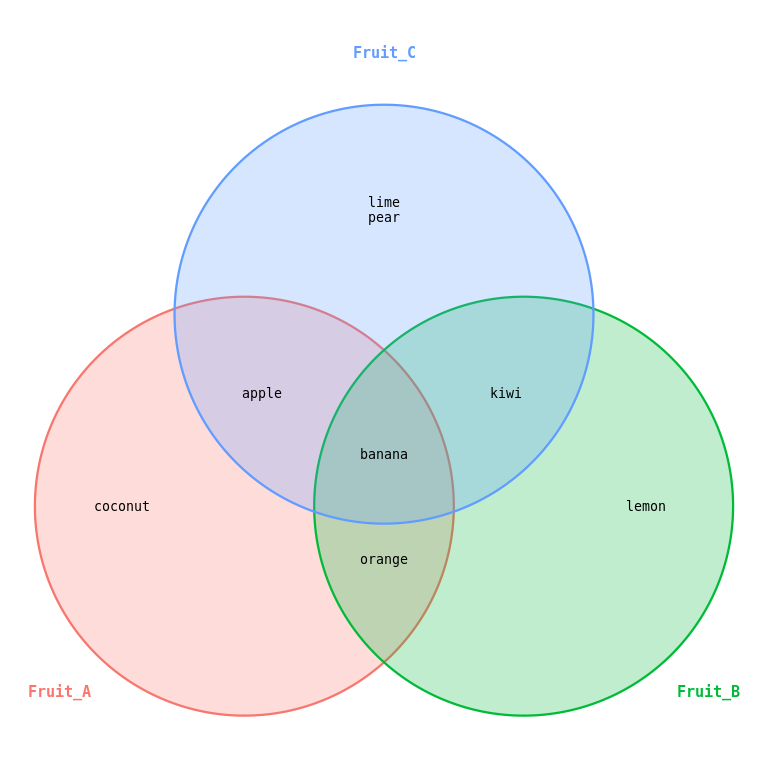 sets <- list(Fruit_A = c("apple","banana","coconut","orange"), Fruit_B = c("banana","kiwi","lemon","orange"), Fruit_C = c("banana","kiwi","apple","pear","lime"))