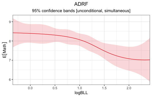 logBLLandMathadjusting for the included potential confounders, based on rejection of the hypothesis that the ADRF is flat forlogBLLvalues between -0.3567 and 2.4248 (p < .0001). There isn’t evidence that the ADRF is nonlinear within this range (p = .3153). The linear projection has a coefficient of -.643 (p < .0001), indicating that the expected potential outcome ofMathdecreases by this amount for each unit increase inlogBLL.