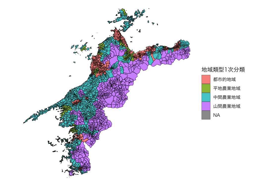 地域類型1次分類 = factor(地域類型1次分類, labels = c("都市的地域", "平地農業地域", "中間農業地域", "山間農業地域"))
