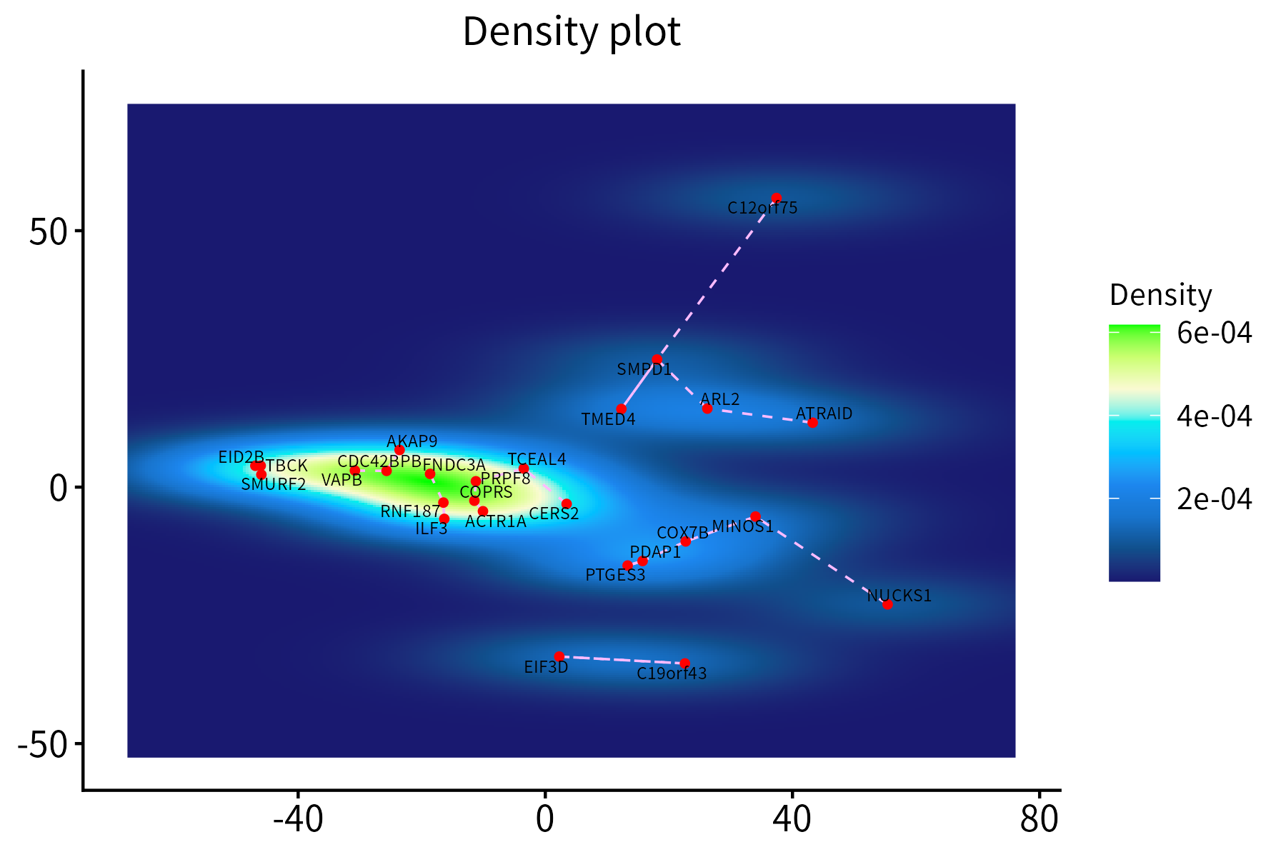 This function creates a density plot for a set of points, optionally
