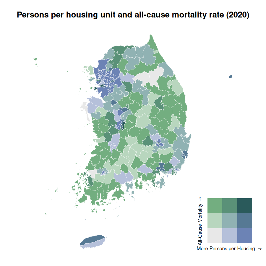 Moving on to a complex example, the code below demonstrates to generate a bivariate map with persons per housing unit and all-cause mortality rate.