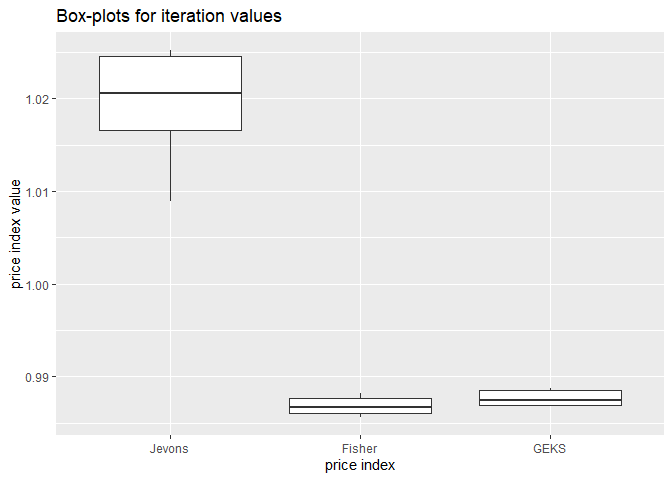 #> 3 GEKS 0.988 0.00364 0.00368#displaying box-plotes created for the calculated iteration index values