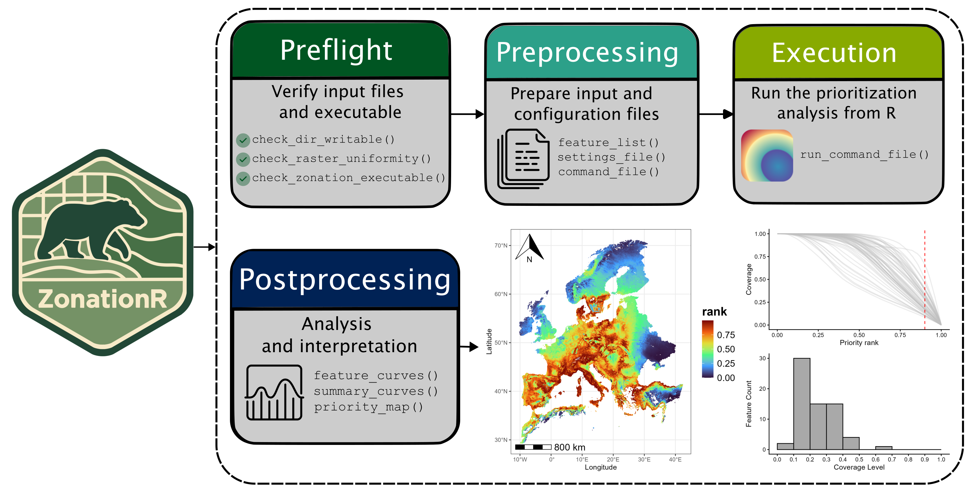 Traditionally, Zonation workflows require manual input preparation, running the software via GUI or command line, and separate post-processing in R or GIS. ZonationR simplifies this process by integrating all steps into R, enabling transparent and automated workflows.