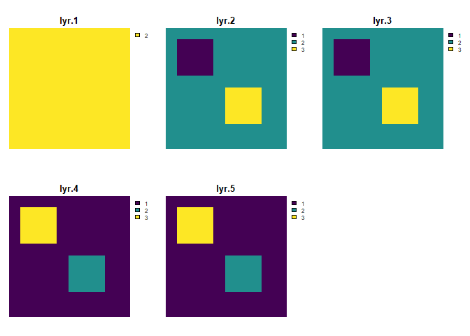 r <- rast(nrows = 20, ncols = 20) values(r) <- rep(1:3, length.out = ncell(r))