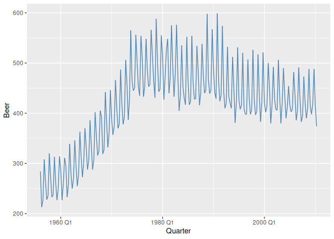 remotes::install_github("mitchelloharawild/ggtime")The simplest time series visualisation is the time plot, which shows