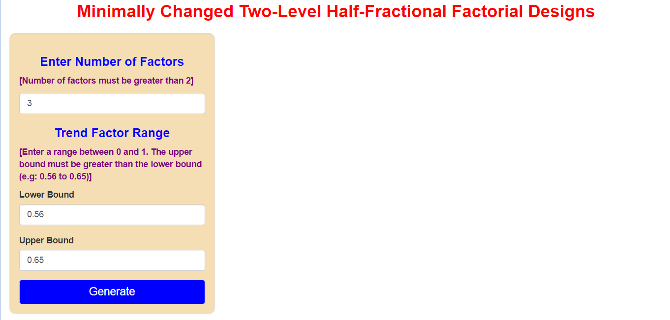 In Design of Experiments (DOE) theory, the two levels of a factor can be represented as integers, e.g., –1 for the low level and 1 for the high level. A half replicate of a \(2^k\) Factorial Designs (\(\tfrac{1}{2} \, 2^{k}\)) with the minimum possible number of changes can be constructed by first developing a \(2^{\,k-1}\) factorial with minimal level changes in its run orders, and then generating a new factor by taking the product of all the 𝑘−1 factors in the constructed \(2^{\,k-1}\) design with minimally changed run orders, where 𝑘 is the number of factors.