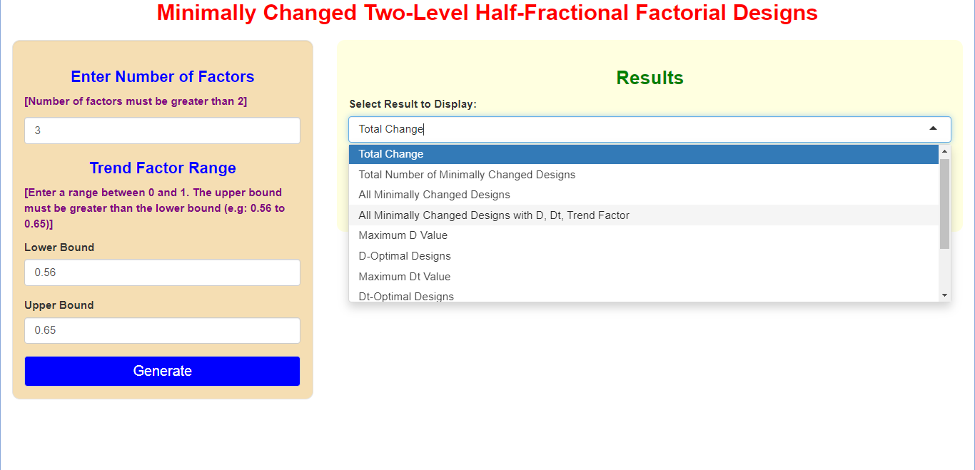 Dt-Optimal Designs Designs with the Maximum Dt-value within the generated minimally changed designs.