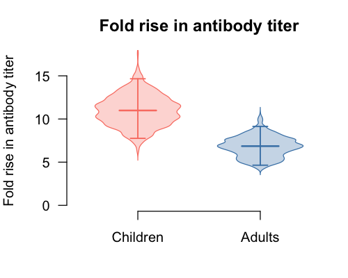 Violin plots of the posterior fold-rise in antibody titer after infection, with median crossbar and 95% credible interval.