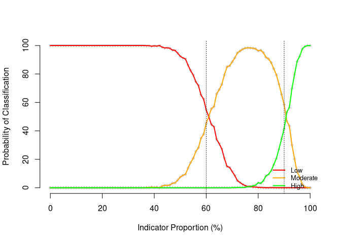 It is useful to be able to assess the performance of the classifier chosen for a SLEAC survey. For example, in the context presented above of an area with a population of 600, a sample size of 40 and a 60% and 90% threshold classifier, the performance of this classifier can be assessed by first simulating a population and then determining the classification probabilities of the chosen classifier on this population.