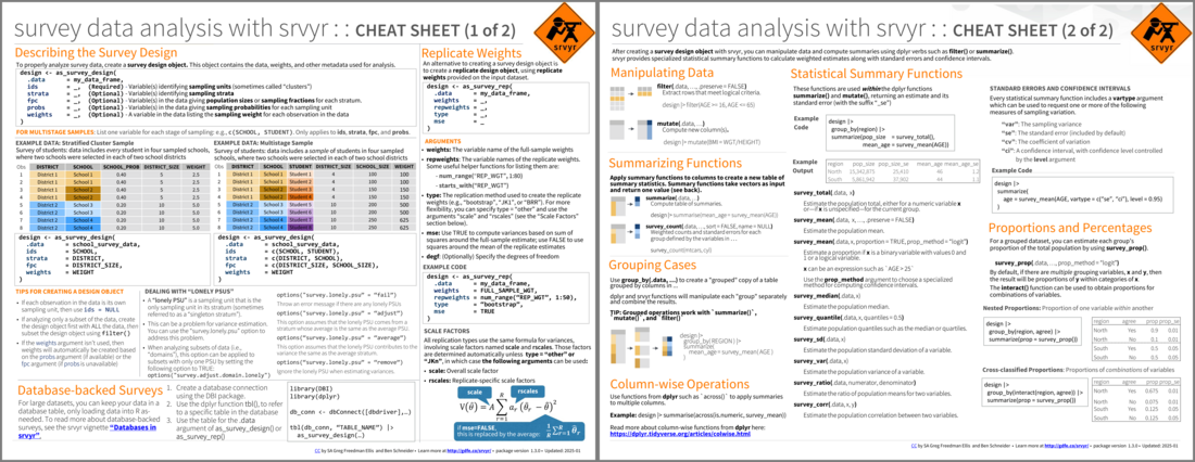 I think the best way to get help is to form a specific question and ask it in some place like posit’s community website (known for it’s friendly community) or stackoverflow.com (maybe not known for being quite as friendly, but probably has more people). If you think you’ve found a bug in srvyr’s code, please file an issue on GitHub, but note that I’m not a great resource for helping specific issue, both because I have limited capacity but also because I do not consider myself an expert in the statistical methods behind survey analysis.