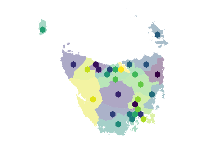 centroids <- create_centroids(tas_lga, "lga_code_2016")To tessellate correctly, all the hexagons must be evenly spaced. This function creates a grid of possible locations for the polygons.