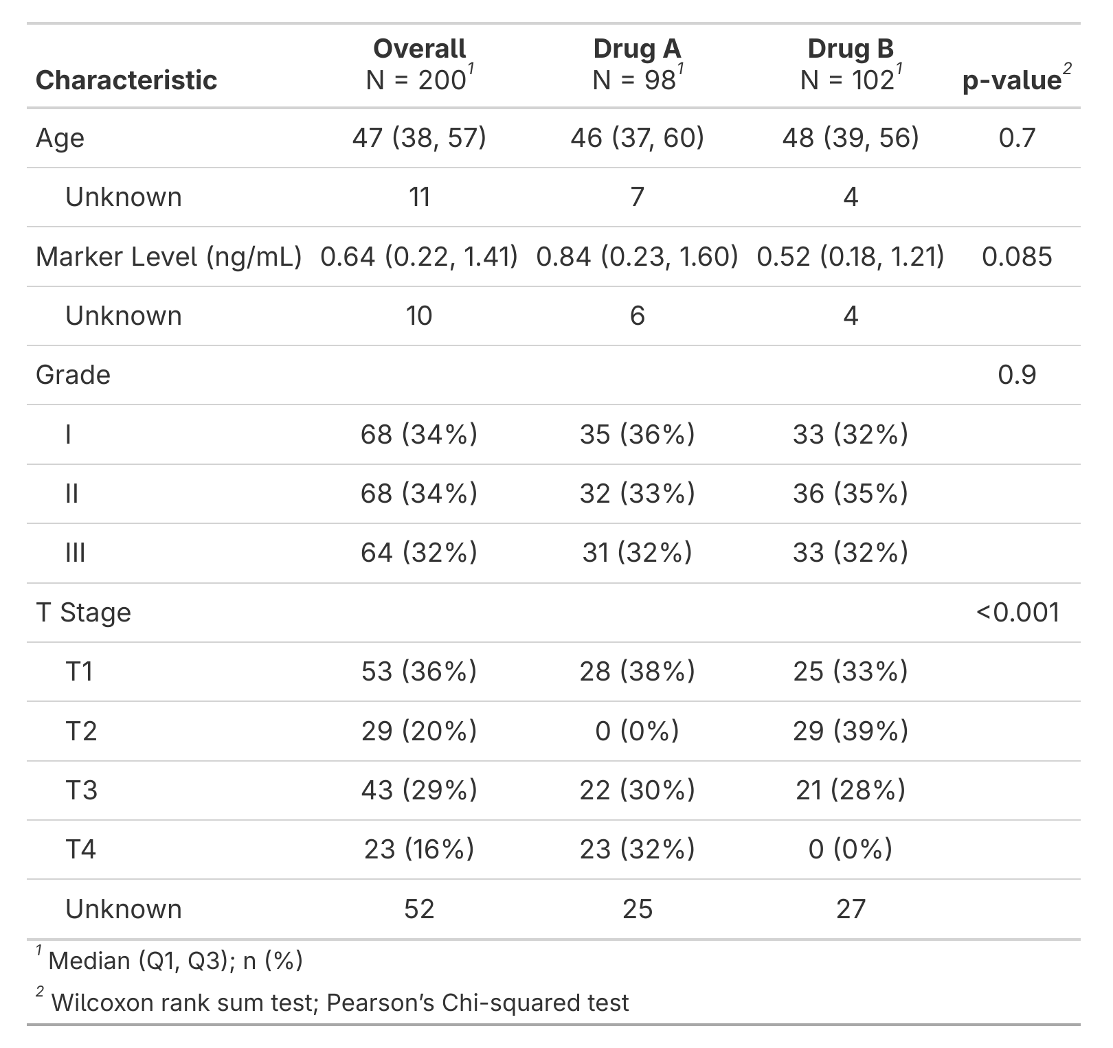 extras() # Warns that overall/p-values aren't supported, but still bolds labels and cleans headersYou’ll see a warning like: “This table is not stratified. Overall column and p-values require stratification. Applying only bold_labels() and modify_header().” but your table is still successfully formatted!