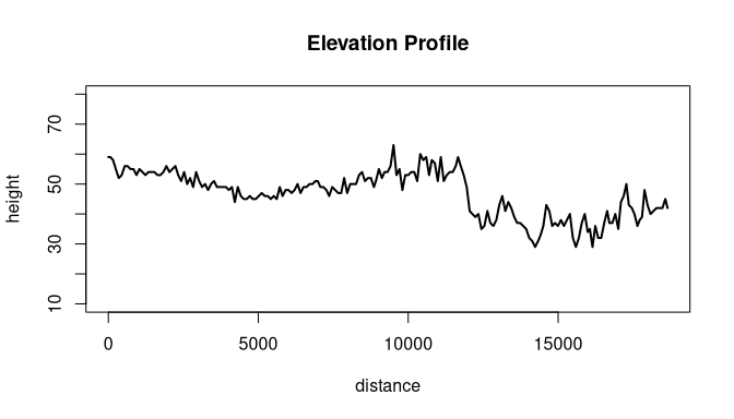 elev <- vl_elevation(loc = pts_route, sampling_dist = 100)The object returned is an sf object with a point for each location where the altitude has been sampled and with the attributes ‘distance’ (the cumulative distance to the first point) and ‘height’ (the altitude).