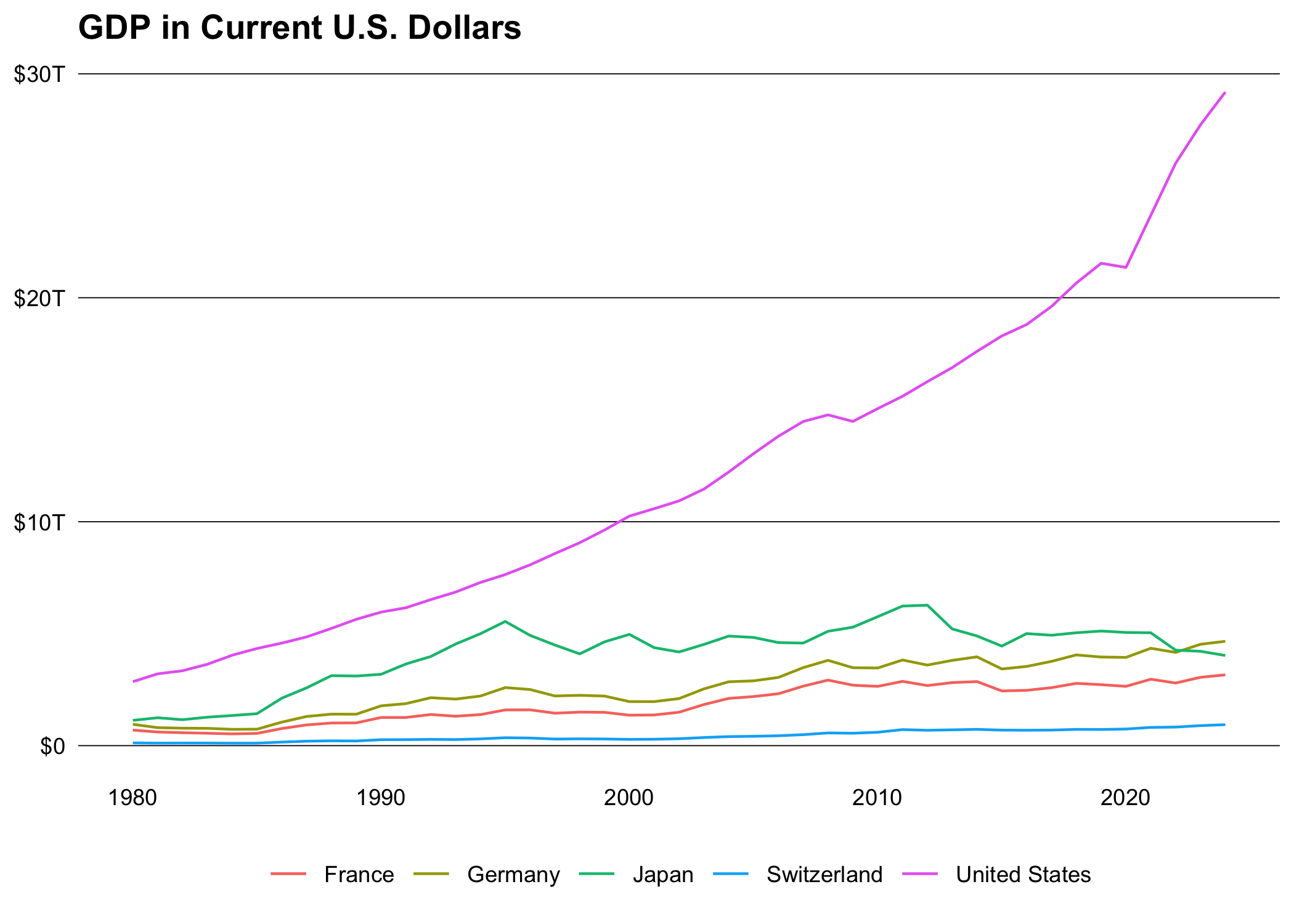 labs(title = "GDP in Current U.S. Dollars", color = "Country")